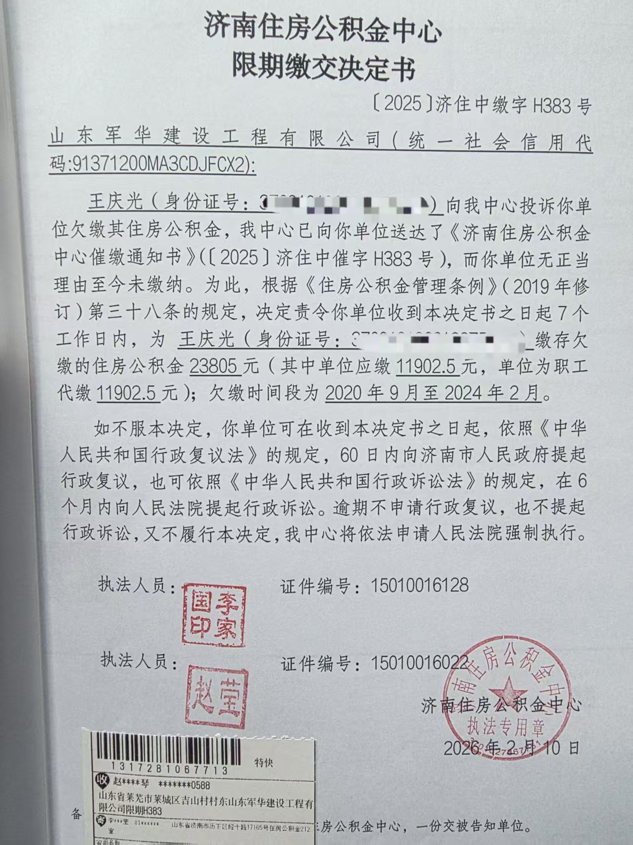 限期缴交决定书【2025】济住中缴字H383号