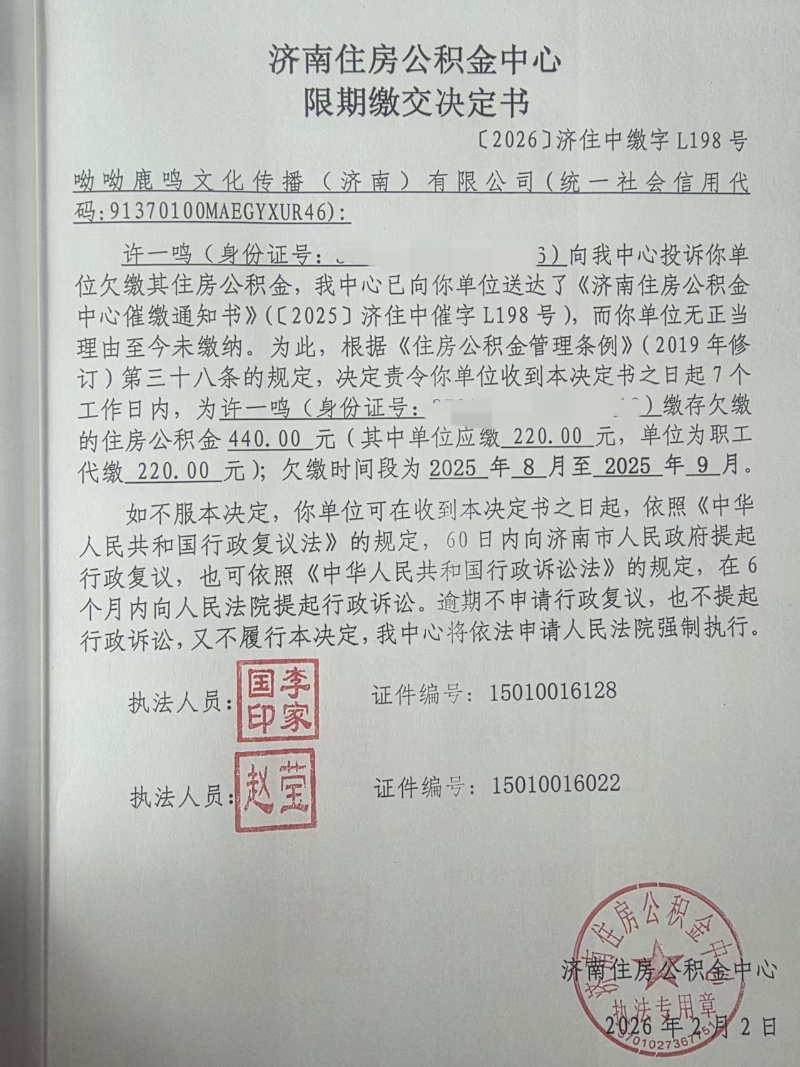 限期缴交决定书【2026】济住中缴字L198号